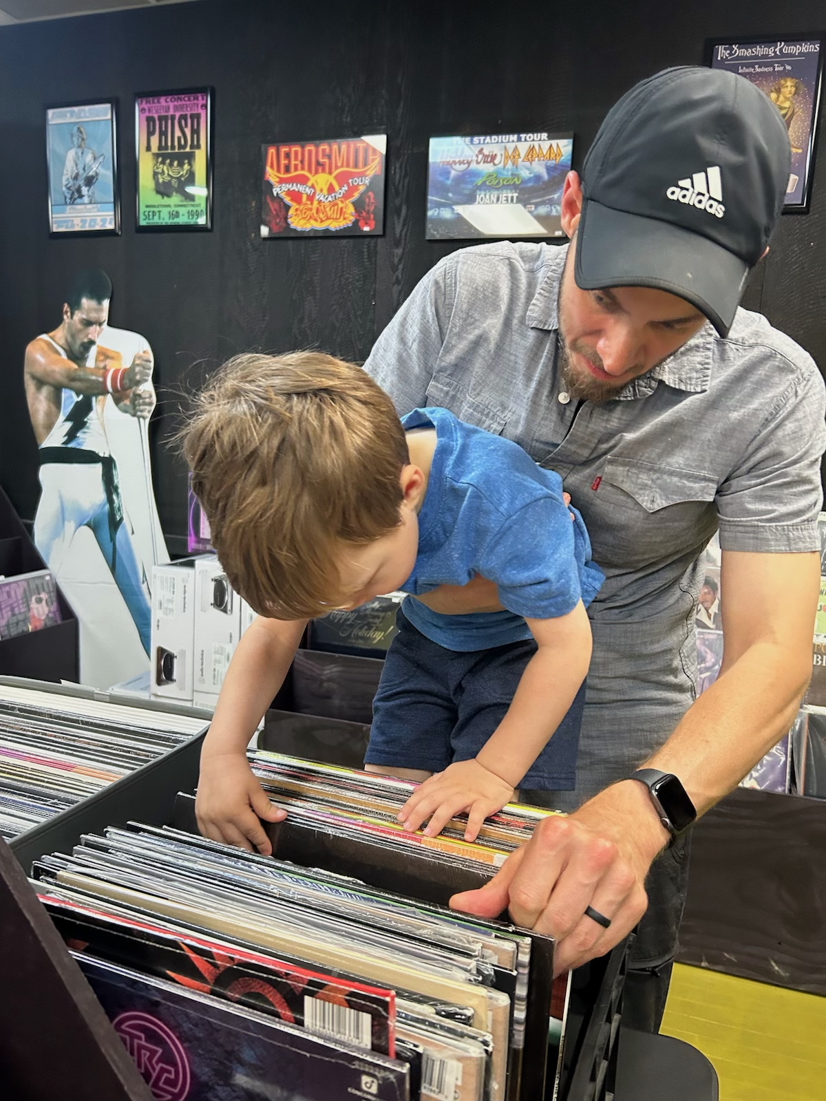 All of this is racing through my head as I’m standing there holding my son. I’m methodically flipping through the bin when he suddenly reaches out.