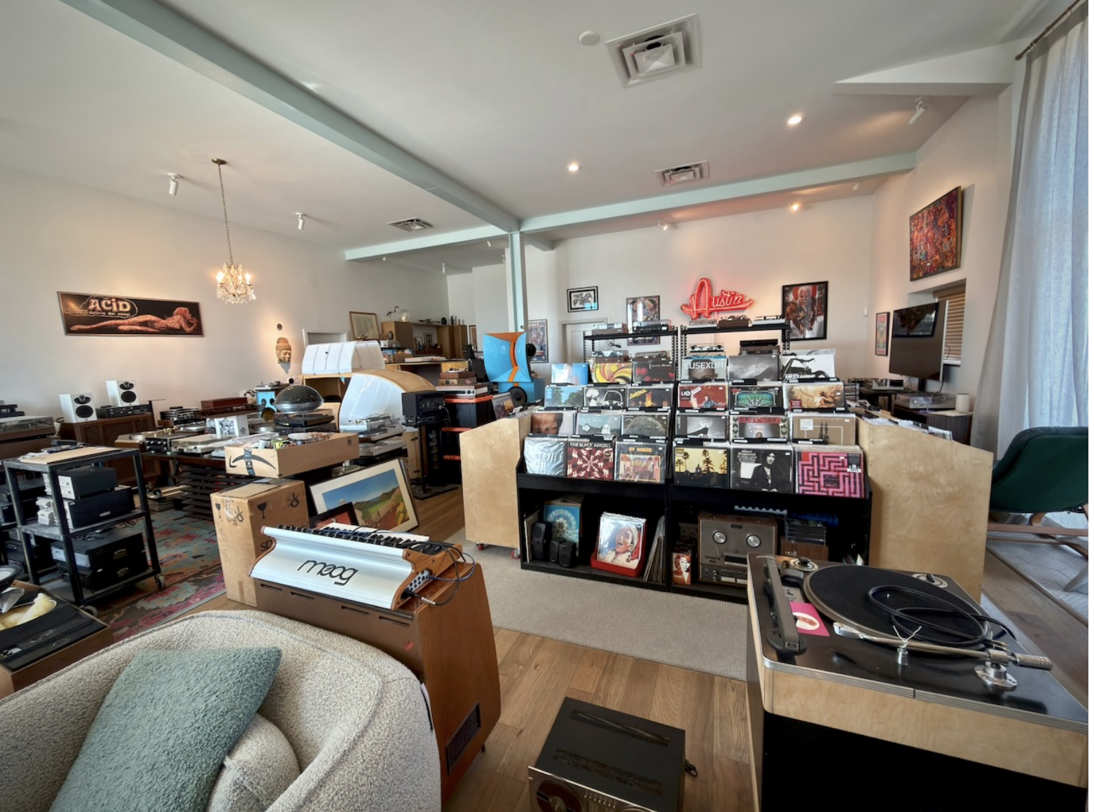 The store is huge, but as you can see from the photo, it’s a workshop with stereo equipment scattered around in various states of repair.